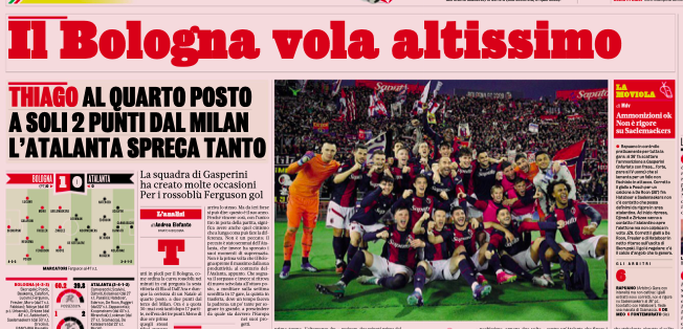 Il Bologna vola altissimo è invece l'apertura di Gazzetta dello Sport