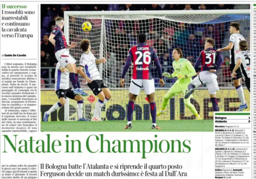 'Natale in Champions' è il titolo del Corriere di Bologna con la foto in primo piano dello stacco di Ferguson.