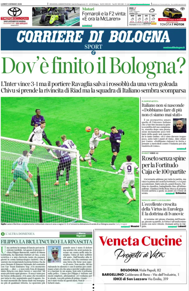 Dov'è finito il Bologna? E' invece la domanda che si pone il Corriere di Bologna. Ravaglia salva i rossoblù da una goleada, la squadra di Italiano sembra scomparsa.