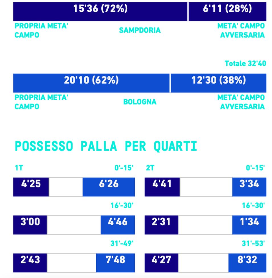 Bologna nettamente superiore anche in termini di possesso palla con 32'40" di possesso sui 53 minuti effettivi, al cospetto di un possesso di 22' della Samp. Bologna superiore anche nella metà campo altrui con un possesso di 12'30" contro i soli 6'11" della Samp. Bologna in comando della partita anche nei vari quarti di gioco e solo ad inizio ripresa i blucerchiati hanno tenuto più palla dei rossoblù. Impressionante invece il dato dell'ultimo quarto d'ora, con il Bologna a comandare per 8'32" contro 4'27".