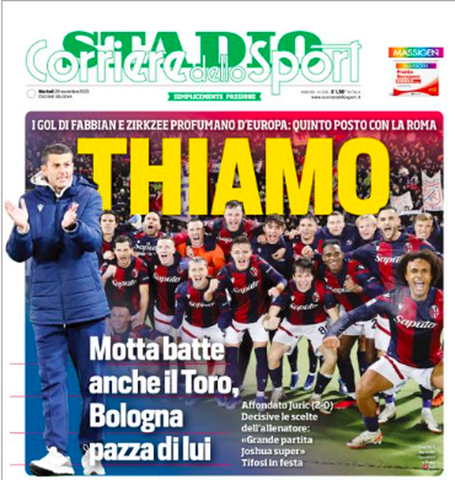 E' esaltazione totale anche sul Corriere dello Sport che si sofferma sul lavoro di Thiago Motta e con un gioco di parole titola 'Thiamo': Motta batte anche il Toro, Bologna pazza di lui'