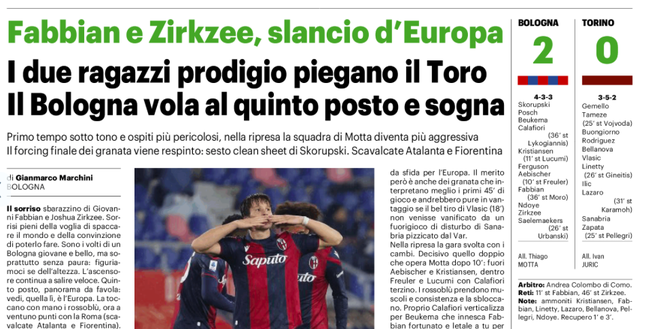 Si parla di Europa anche sul Resto del Carlino dopo la vittoria due a zero sul Toro, nello scontro diretto, grazie a Fabbian e Zirkzee: per il quotidiano è 'slancio d'Europa'.