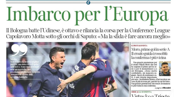 Il Corriere di Bologna rilancia la corsa europea dopo la vittoria tre a zero sull'Udinese e titolar 'Imbarco per l'Europa'. La squadra rossoblù è ottava e può sperare in altre penalizzazioni della Juve.