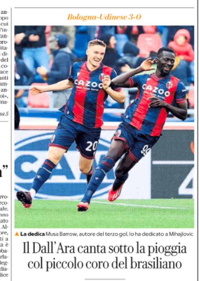 'Il Dall'Ara canta sotto la pioggia col piccolo coro del brasiliano' è invece il titolo di Repubblica che esalta il lavoro di Thiago Motta e del collettivo.
