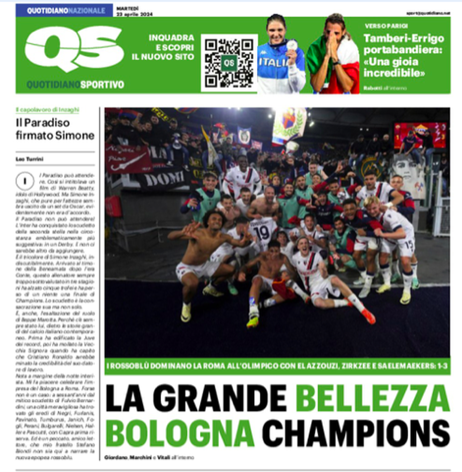 'La grande bellezza. Bologna Champions' è il titolo scelto dal Resto del Carlino che inserisce nella prima pagina sportiva la foto di gruppo sotto lo spicchio ospiti dell'Olimpico