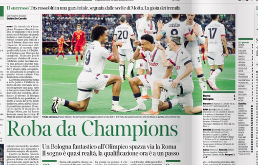 'Roba da Champions', infine, è il titolo scelto nelle pagine interne del Corriere di Bologna con l'immagine di Zirkzee che esulta con Dan Ndoye in occasione del secondo gol. Rossoblù più vicini alla Champions.