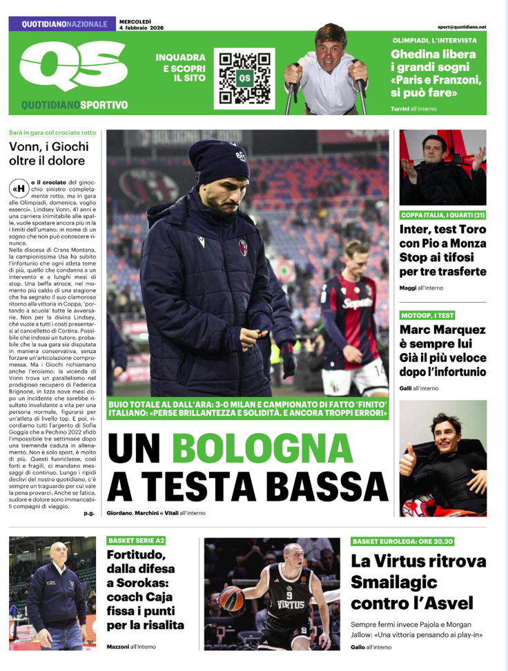 'Un Bologna a testa bassa' è il titolo del Quotidiano Sportivo