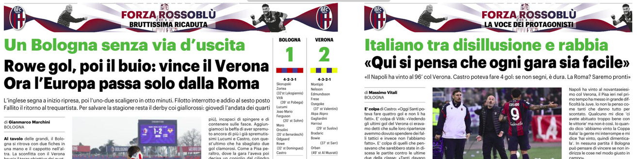Bologna senza via d'uscita scrive il Quotidiano Sportivo: ora l'Europa passa solo dalla Roma.