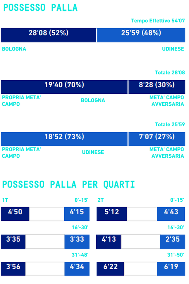 Bologna-Udinese ha dato come esito di campo un perentorio 3-0 a favore rossoblù. Ma è stata davvero una partita a senso unico? No, e l'impressione di campo può essere già abbastanza. Ma a confermare le prime impressioni sono i numeri e statistiche della Lega Serie A. In questo caso sul possesso palla, praticamente in equilibrio fra le due compagini. Con una possessione nemmeno troppo pericolosa, alla fine. Ovverosia, non c'è stato un grande dominio di una delle due squadre sull'altra. Per entrambe (70% Bologna, 73% Udinese) la maggior parte del proprio possesso è avvenuto nella propria metà campo, quindi innocuo.