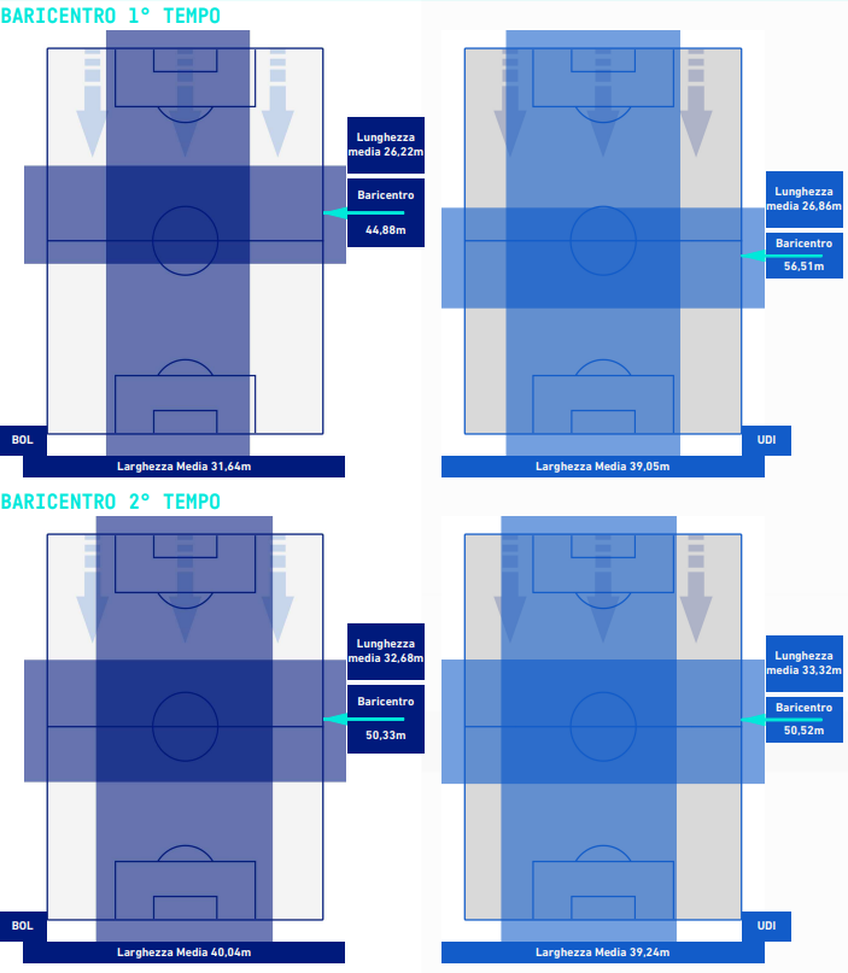 Il baricentro ricalca piuttosto fedelmente quanto scritto finora. Un Bologna che nonostante i tre goal ha difeso abbastanza, poiché non è stata una partita dominante in tutto e per tutto nell'assetto Udinese. Lo esprime bene il dato dell'altezza baricentro del Bologna nel primo tempo pari a 44 metri, una differenza di 12 metri rispetto a quello dei bianconeri sbilanciati in avanti. Più equilibrato nel secondo tempo.