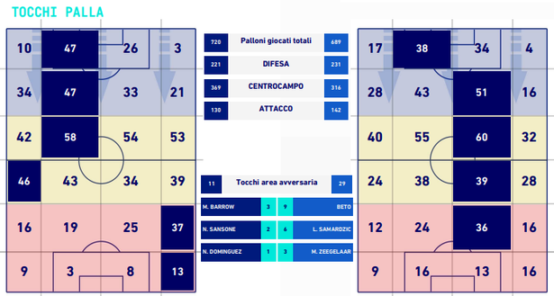 Per ultima istanza, si conferma ancora una volta la tendenza a giocare nella parte sinistra del campo in zona offensiva. Nonostante la costruzione parta dal centrodestra. Questo è anche merito di un Musa Barrow pienamente a suo agio nel ruolo di esterno sinistro, che si conferma anche come migliore nei tocchi in area Udinese (3), uno in più della punta di ruolo Sansone (2).