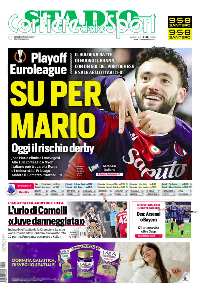 Super Mario è il titolo del Corriere dello Sport Stadio: ora rischio derby.