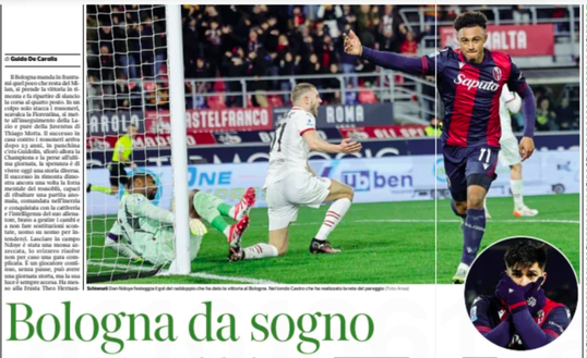 La foto di Castro sul secondo gol e il titolo 'Bologna da sogno''. Così il Corriere di Bologna dopo il successo due a uno sul Milan.