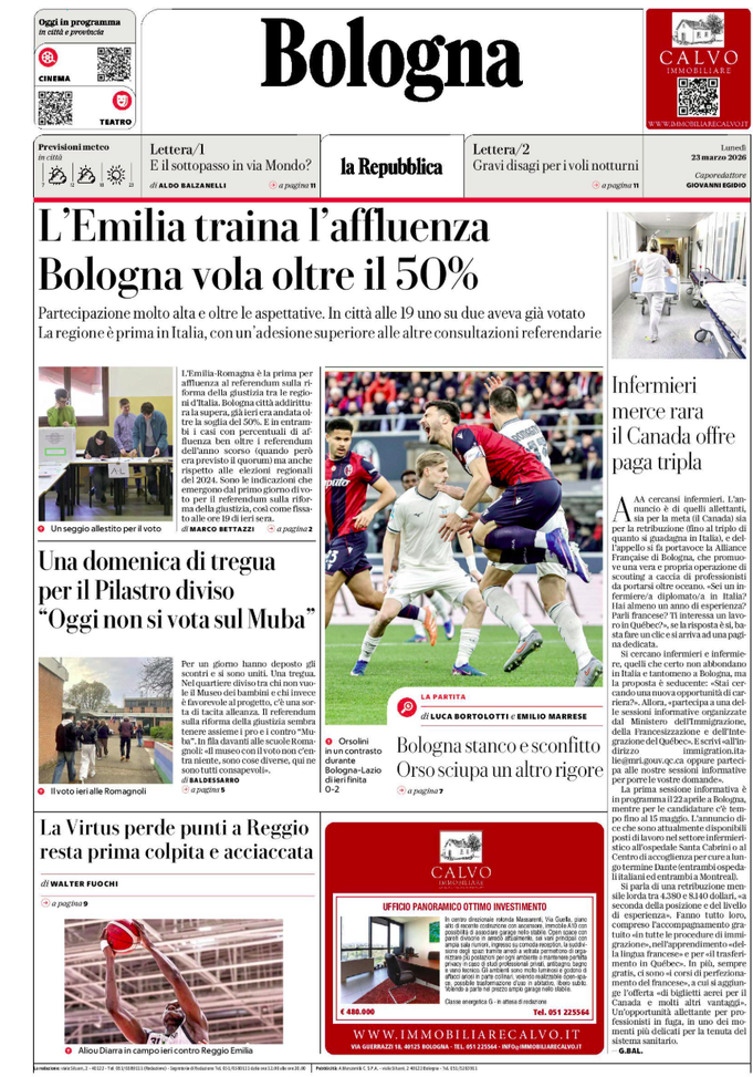'Bologna stanco e sconfitto. Orso sciupa un altro rigore' scrive Repubblica