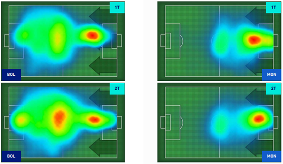 Le heatmap di movimento non smentiscono quanto detto prima, anzi. La colonna sinistra rappresenta i rossoblù, ed è evidente l'occupazione totale del campo da parte del Bologna. Inoltre, in entrambi i tempi, la trequarti del Monza è fra le zone più calpestate da parte di Ferguson e compagni. I brianzoli hanno sfioranto la metà campo bolognese a stento.