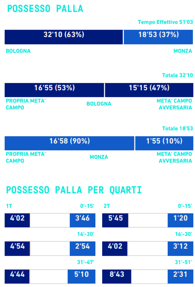 Se il solo possesso palla non basta per vincere, Bologna-Monza lo ha dimostrato perfettamente. Con una percentuale che sfiora il 70% nei novanta minuti di gioco, il dato più sorprendente della partita è senza dubbio quello riguardante il tempo effettivo di possesso del Monza nel secondo tempo: soltanto un minuto e cinquantacinque secondi. Nemmeno due minuti pieni. Il goal di Donati è arrivato nella prima frazione, e l'interpretazione brianzola del secondo tempo è sufficientemente chiara.