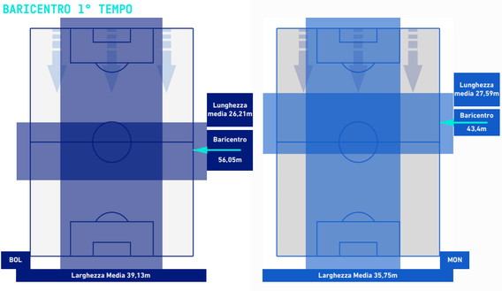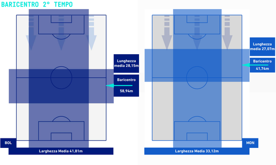Non può che accompagnare anche la sezione del baricentro, con dati clamorosi per la loro disparità. Bologna più vicino ai 60 metri di baricentro, in piena proiezione offensiva, Monza a contenere i tentativi felsinei con il baricentro a 43 metri con la difesa schierata a cinque. Per Palladino è stato facile limitare l'apporto di Ferguson da punta adattata, sicuramente non a suo agio in quel ruolo rispetto ai movimenti da incursore da centrocampista, suo ruolo naturale.