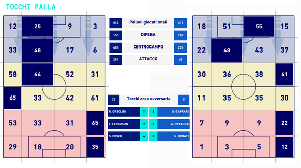Per quanto riguarda i tocchi totali di palla per sezione di campo, si ripresenta la tendenza del Bologna di costruire dal centro-destra per finalizzare in zona offensiva sulla fascia sinistra. Tuttavia, in una partita come questa, è facile pensare che il Monza abbia saputo chiudere il Bologna sulla zona sinistra del campo, lontano dalle idee di Riccardo Orsolinib (in fascia destra) ma soprattutto da quelle di Roberto Soriano, grande escluro della gara. Meno della metà i tocchi offensivi in attacco dei brianzoli rispetto ai rossoblù.