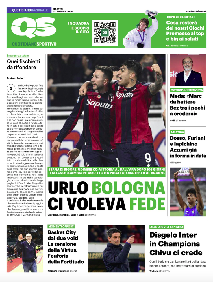 'Urlo Bologna, ci voleva Fede' è la prima pagina del Quotidiano Sportivo