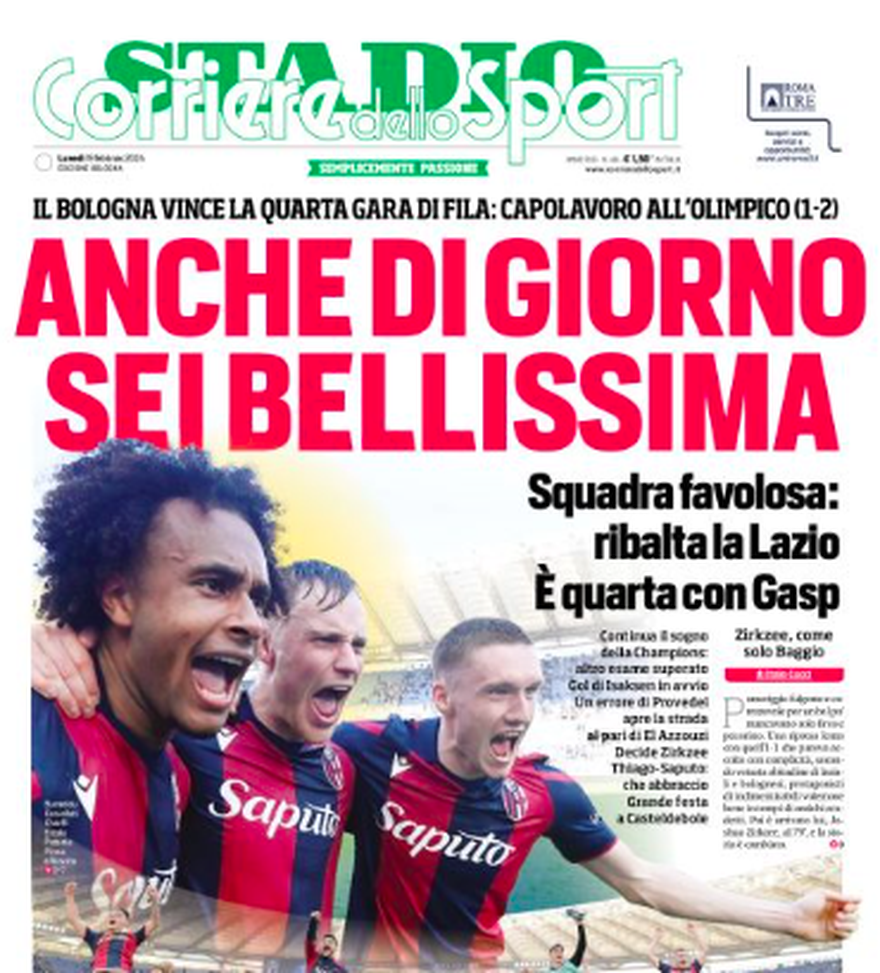 'Anche di giorno sei bellissima' è l'apertura in prima pagina del Corriere dello Sport Stadio. 'Squadra favolosa, ribaltata la Lazio: Bologna quarto con Gasp'. Sono quattro vittorie di fila: capolavoro all'Olimpico.