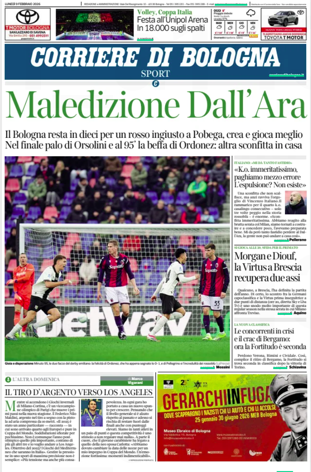 Maledizione Dall'Ara è invece il titolo del Corriere di Bologna: i rossoblù restano in dieci per un rosso ingiusto, creano e giocano meglio ma nel finale Ordonez decreta la sconfitta.