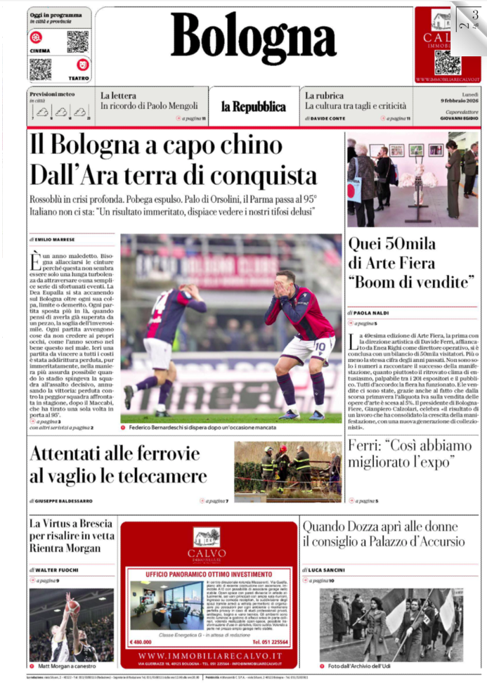 'Il Bologna a capo chino: Dall'Ara terra di conquista', scrive Repubblica Bologna.