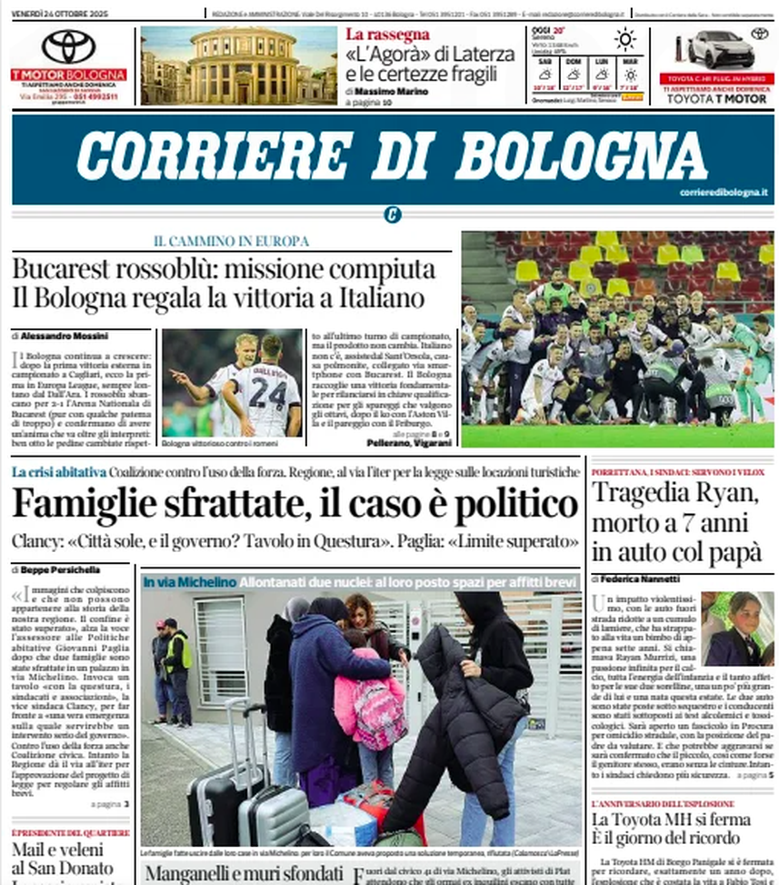 Missione compiuta, scrive invece in prima pagina il Corriere di Bologna. Il Bologma regala la vittoria a Italiano.