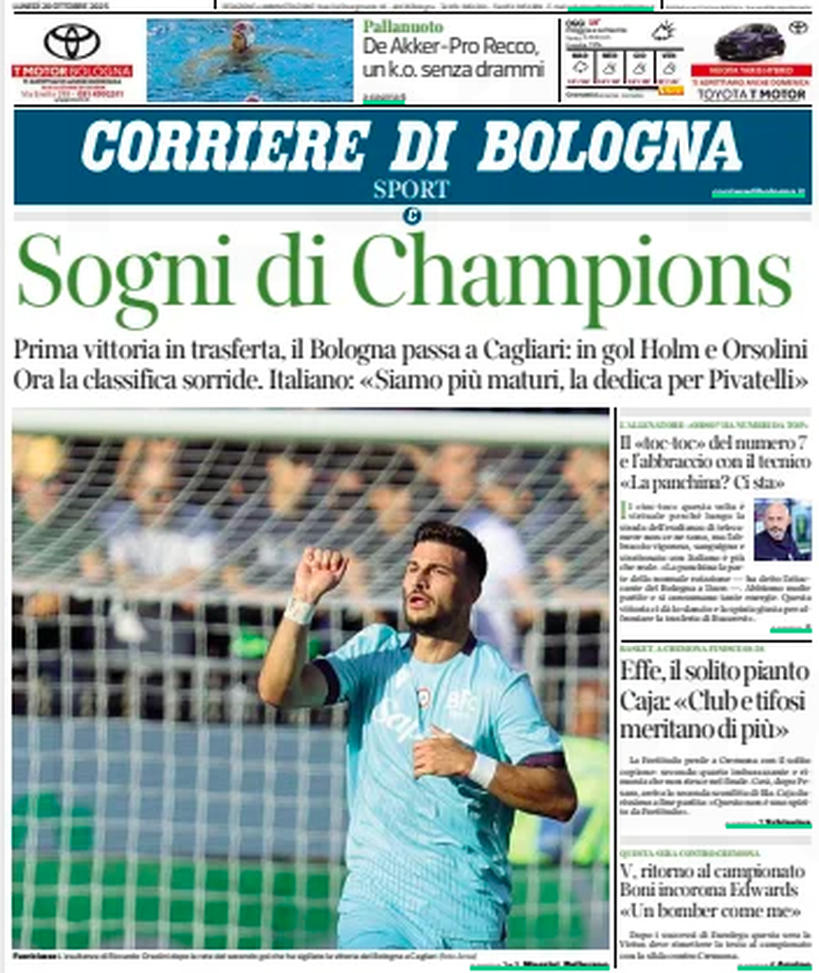 'Sogni di Champions' è il titolo del Corriere di Bologna. Prima vittoria in trasferta, il Bologna passa a Cagliari con Holm e Orsolini. Ora la classifica sorride.