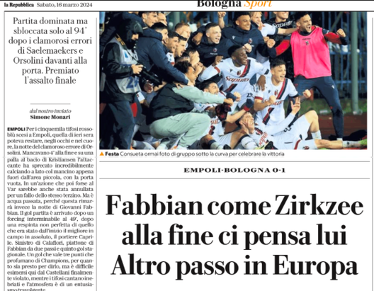 Senza Zirkzee alla fine ci pensa Fabbian. Repubblica apre con il gol del giovane mediano che può essere decisivo nella corsa Champions. Il Bologna fa festa a Empoli: 0-1 e quarto posto consolidato.
