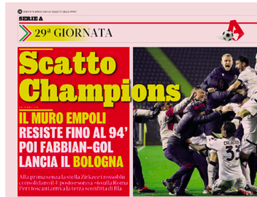 'Scatto Champions' è invece il titolo di Gazzetta dello Sport. Il muro Empoli resiste fino al 94' poi Fabbian scardina la maledizione del Castellani e lancia la volata al quarto posto.