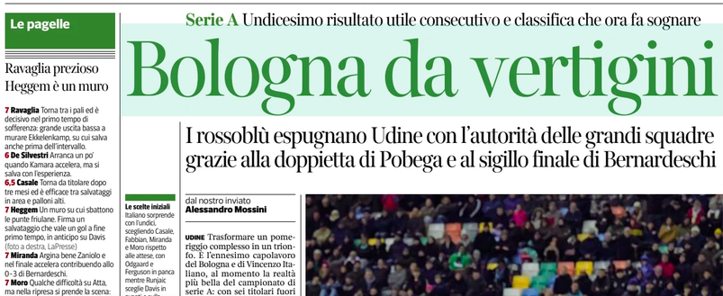 Il Corriere di Bologna apre con 'Bologna da vertigini'. I rossoblù espugnano Udine con l'autorità delle grandi squadre.