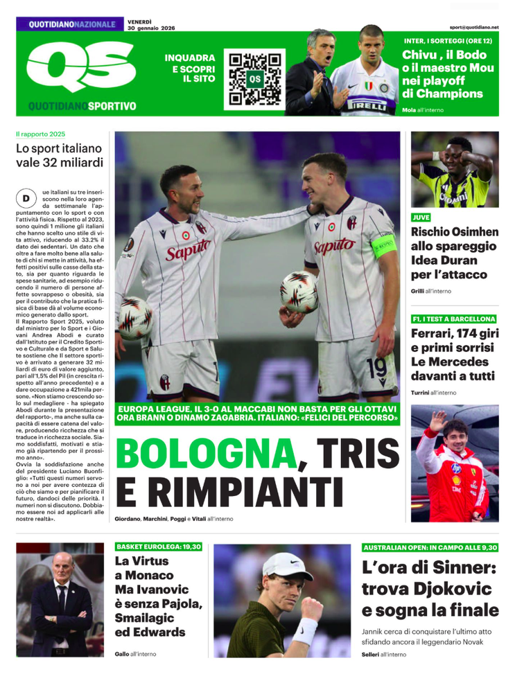 'Bologna, tris e rimpianti' apre il Quotidiano Sportivo. Bologna decimo, ottavi di finale solo sfiorati.