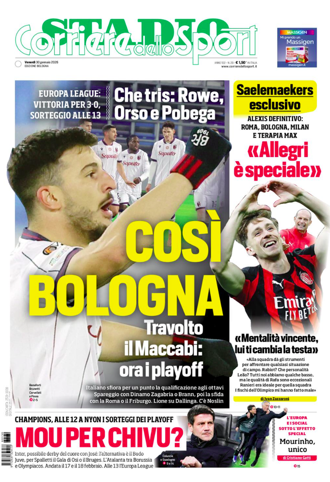 Così Bologna: travolto il Maccabi. Ora i playoff, apre in prima pagina il Corriere dello Sport.