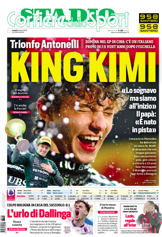 Il Corriere dello Sport Stadio apre con la straordinaria vittoria di Kimi Antonelli in Cina: è il più giovane di sempre a conquistare un gp di Formula 1. In taglio basso: l'Urlo di Dallinga.