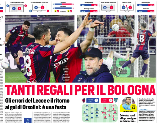 'Tanti regali per il Bologna' titola il Cor Sport: gli errori del Lecce e il ritorno al gol di Orsolini. E' festa.