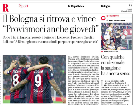 'Il Bologna si ritrova e vince' scrive in prima pagina l'edizione bolognese di Repubblica.