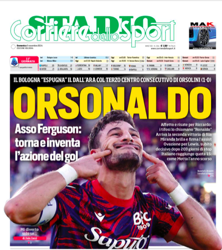 Il Corriere dello Sport apre con la foto di Orsolini e il titolo 'Orsonaldo' dopo la vittoria del Bologna al Dall'Ara sul Lecce per uno a zero. 'Asso Ferguson, torna e inventa l'azione del gol'.