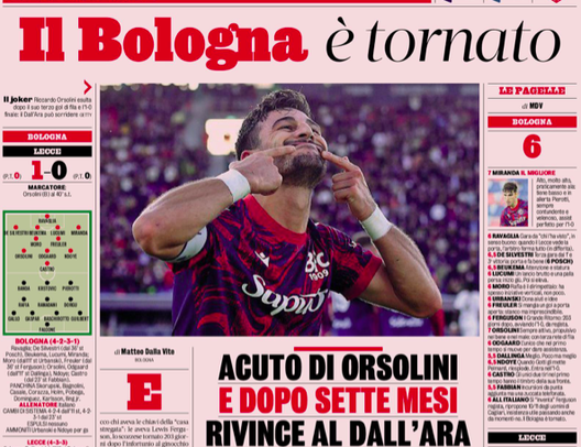 Il Bologna è tornato è invece il titolo di Gazzetta dello Sport che nelle pagine interne scrive 'Acuto di Orsolini, dopo sette mesi rivince al Dall'Ara'.