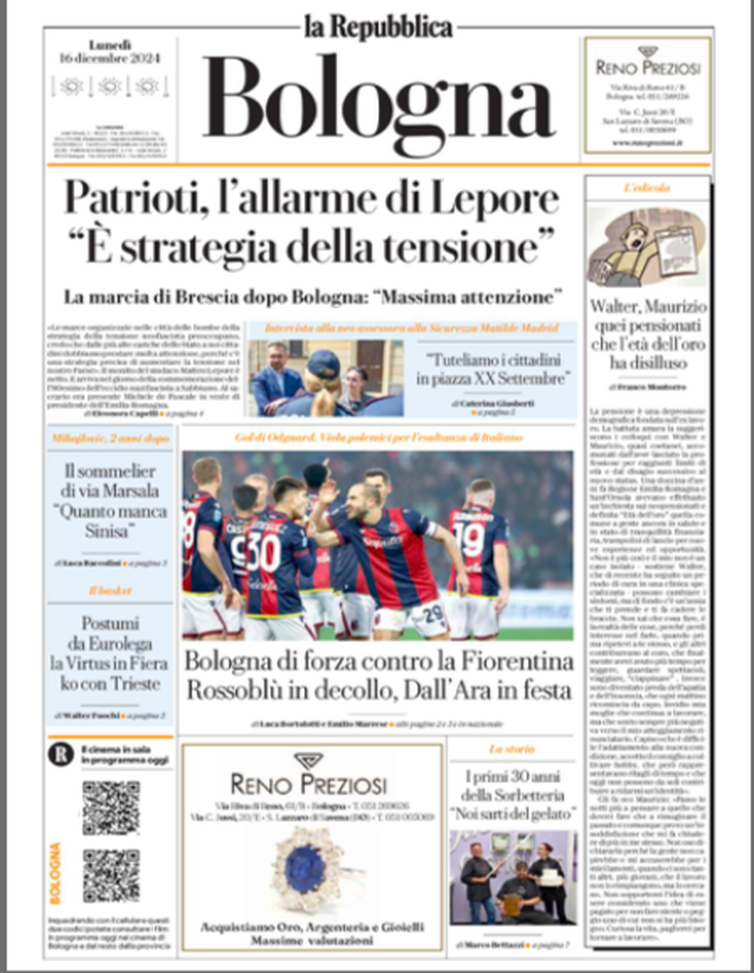 'Bologna di forza contro la Fiorentina. Rossoblù in decollo e Dall'Ara in festa' scrive in pagina Repubblica Bologna