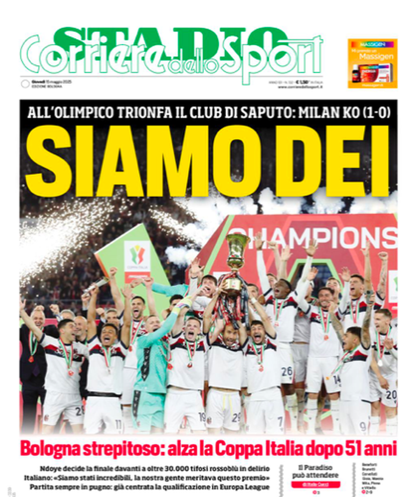 'Siamo Dei' è il titolo scelto dal Corriere dello Sport Stadio sul trionfo del Bologna in Coppa Italia.