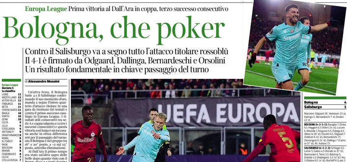 'Bologna, che poker' è l'apertura del Corriere di Bologna: contro il Salisburgo va a segno tutto l'attacco.
