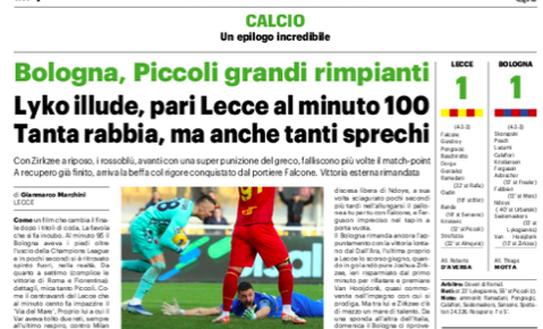 Il Resto del Carino va invece sui rimpianti rossoblù. Il pareggio di Lecce è difficile da mandare giù, una sorta di spreco dopo la magia di Lykogiannis.