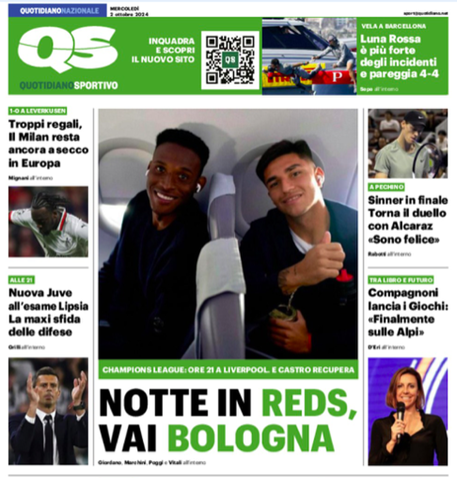 'Notte in Reds' è invece il titolo scelto dal Resto del Carlino. Italiano parla di 'spirito strepitoso' mentre Skorupski carica: "Niente paura, una città ci guarda".