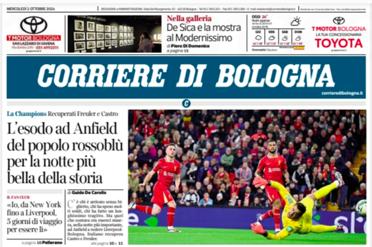 'L'esodo ad Anfield del popolo rossoblù per la notte più bella della storia' scrive il Corriere di Bologna in prima pagina. Il tifoso da New York: "Tre giorni di viaggio per essere lì".