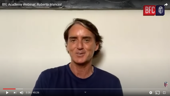 Il Bologna ha lanciato la Bfc Academy Webinar con i ragazzi del settore giovanile che incontreranno varie personalità del mondo dello sport e dello spettacolo. Il primo ospite è stato il commissario tecnico della nazionale italiana Roberto Mancini. I dirigenti e i ragazzi rossoblù si sono alternati nelle domande al ct, con una chicca finale di un aneddoto su Mihajlovic.