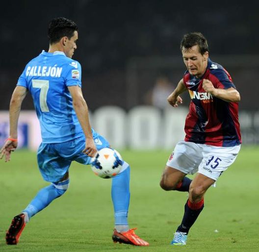 Il Napoli, Vicecampione d'Italia in carica, vuole partire in grande e al 5' c'è una grande occasione con Callejon che raccoglie un pallone rimbalzato via dopo un contrasto tra Hamsik e la retroguardia del Bologna, tirando e cogliendo il palo, facendo correre brividi sulle schiene di entrambe le tifoserie.