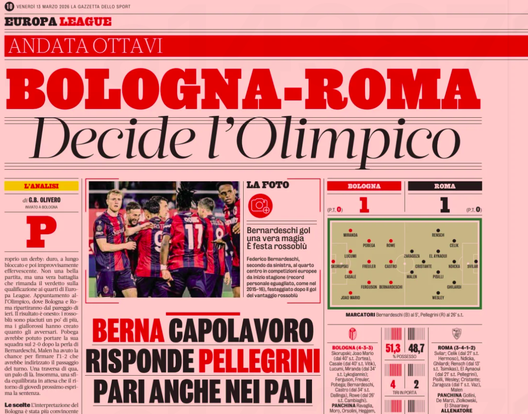 Bologna-Roma si decide all'Olimpico, scrive Gazzetta. Capolavoro di Berna, risponde Pellegrini.