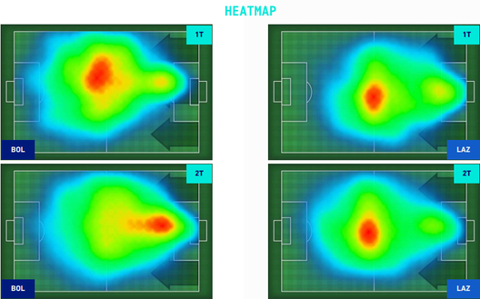 Heatmap, o dell'interpretazione del campo da gioco. Per la Lazio abbiamo una continuità d'interpretazione nell'arco dei due tempi, il Bologna passa da un'interpretazione globale-orizzontale a una verticale, più offensiva. Da evidenziare l'angolo concavo in alto a sinistra nell'heatmap della Lazio del primo tempo: significa che la fascia destra biancoceleste ha fatto fatica a sfondare. Il triangolo fra Pedro, Milinkovic-Savic e Lazzari non ha saputo ottenere grossi spazi dai contrapposti Cambiaso, Schouten e Kyriakopoulos.
