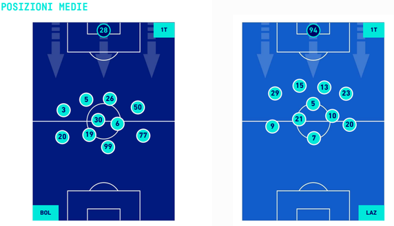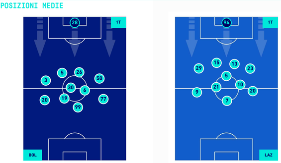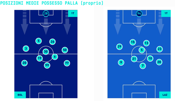 Questa la grafica sulle posizioni medie dei calciatori quando la propria squadra è in possesso del pallone. Per entrambe le squadre si plasma un 4-3-3, poiché Ferguson occupa la zona di mezzala destra. Bologna leggermente più largo in fase di possesso rispetto alla Lazio, con Vecino da vertice basso atipico, dal momento che l'uruguagio nasce centrocampista incursore.