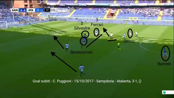 Il sistema nella fase difensiva ha però delle debolezze, guardiamo quest'immagine del gol subito dalla Samp nella partita interna contro l'Atalanta: Strinic esce sul portatore di palla avversario, "rompendo" e abbandonando la linea difensiva, il centrale vicino (Ferrari) rimane in posizione insieme a Silvestre e all'altro terzino Bereszynski per aumentare la densità centrale. Per il posizionamento in fase di non possesso, come da manuale della difesa a zona, il primo criterio è la posizione del pallone, seguito dalla posizione del compagno, mentre l'avversario non ha la priorità, infatti, questo permette alla mezzala destra dell'Atalanta di sfruttare lo spazio in ampiezza, lasciato libero da Strinic, e inserirsi. Sul lato debole, o cieco (ovvero quello opposto al pallone), invece, notiamo che due giocatori dell'Atalanta sono liberi di inserirsi dato che la mezzala, in questo caso Barreto, non segue l'azione e non dà copertura, dunque sul lato sinistro i bergamaschi sono in superiorità numerica. La disposizione a zona della difesa blucerchiata è fragile agli attacchi laterali, non è un caso infatti che la maggior parte dei gol subiti quest'anno dalla Sampdoria si sia sviluppato sugli esterni con cross o inserimenti senza palla tra le maglie della difesa.